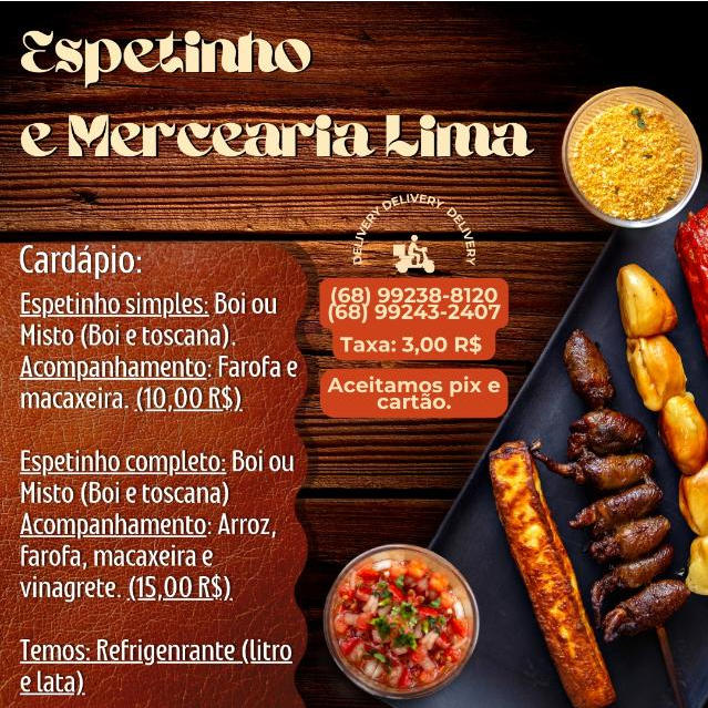 O Espetinho e Mercearia Lima oferece deliciosos espetinhos preparados na hora, com opções de boi ou misto (boi e toscana), acompanhados de farofa, macaxeira e outras opções completas com arroz e vinagrete. Um lugar ideal para quem busca sabor, qualidade e aquele churrasquinho bem feito. Também contamos com bebidas geladas e serviço de delivery para levar mais praticidade até você. Aceitamos Pix e cartão.